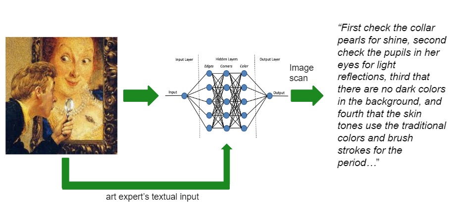 Suppose we trained a neural net to recognize every known van Gogh painting as a "genuine" van Gogh, and every other painting, including high-quality imitations, as "fake" van Goghs. Let's call this net the "Critic." The Critic is also able to explain how to paint a genuine van Gogh stroke by stroke. And suppose we partially train another neural net to both generate and recognize actual van Goghs, but not as accurately as the Critic. Let's call this second net the "Apprentice."