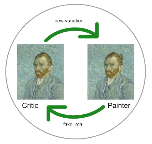 Next, we have the Apprentice generate a van Gogh while the Critic is watching. As the Apprentice makes mistakes, the Critic immediately notices and warns the Apprentice about them in detail. The Apprentice self-corrects and keeps tabs on its corrections. They play adversarial roles. Eventually, the Apprentice becomes as good as if not better than the Critic at generating perfect van Goghs.