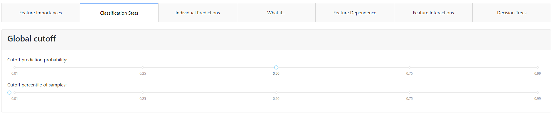 At the very top of the tab, we can set a global cut-off for the entire tab. The classification model returns the probability that a given event will occur. If this probability is below the cut-off value, it will take a value of 0, and above it will take a value of 1. For a cut-off threshold set in this way, we will have graphs and metrics calculated in this tab that need a specific class predicted, not the probability itself.
