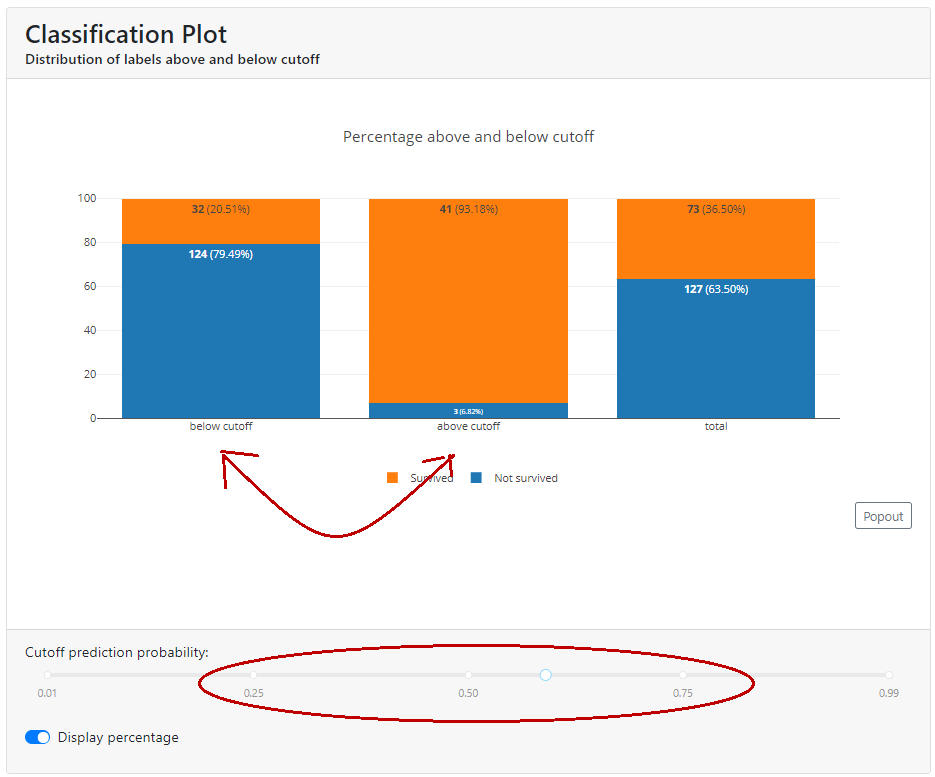 In this graph, we see the percentage of each class if we select the top X % of customers. In the example below, for a cut-off equal to 0.59, you can see that below this value is 22.5% of the population, with survivors accounting for just over 91% and deaths less than 9%.